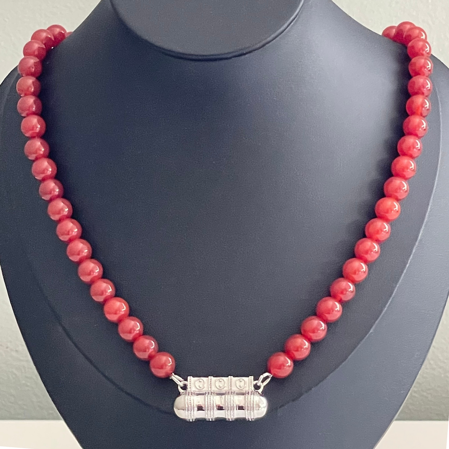 Cawo is inspired by a Somali capsule amulet necklace. With the beautiful detailed engraving and the vibrant agate beads, she will surely elevate your outfit.