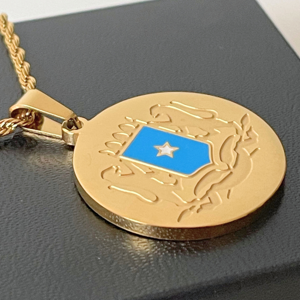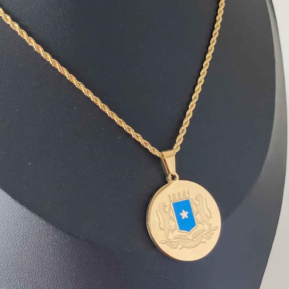 This exquisite round disc pendant proudly displays the somali flag on a shield, flanked by two powerful leopards standing on top of spears. Portraying strength and bravery, this design creates a powerful and impactul depiction.